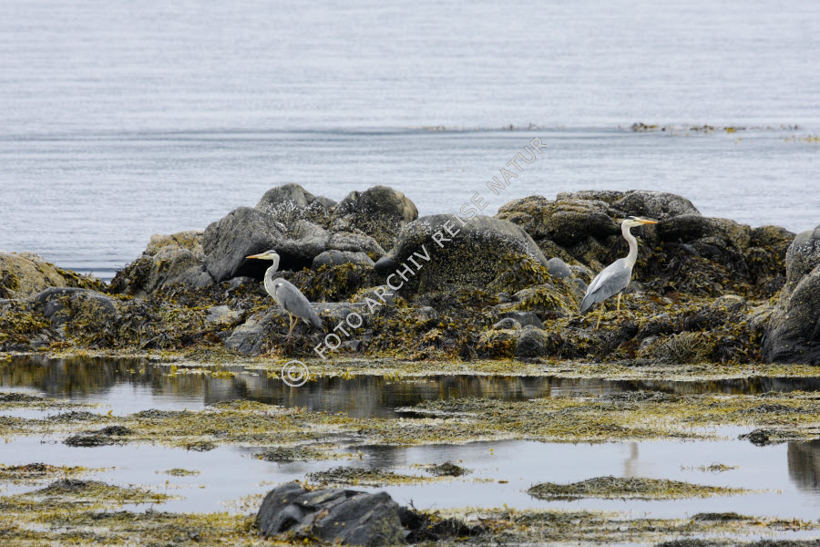 Keywords: Algen, Blasentang, Fucus vesiculosus, Farbe, Fauna, Flora, Gewässer, Graureiher, Ardea cinera, Insel, Insel Runde, Körperteil, Landschaft, Meer, Møre og Romsdal, Nordmeer, Norwegen, Reiher, Schnabel, Seetang, Vogel, grau,
