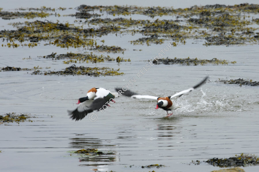 Algen, Blasentang, Fucus vesiculosus, Brandgans, Tadorna tadorna, Entenvögel, Fauna, Flora, Gewässer, Insel, Insel Runde, Landschaft, Meer, Møre og Romsdal, Nordmeer, Norwegen, Seetang, Vogel,