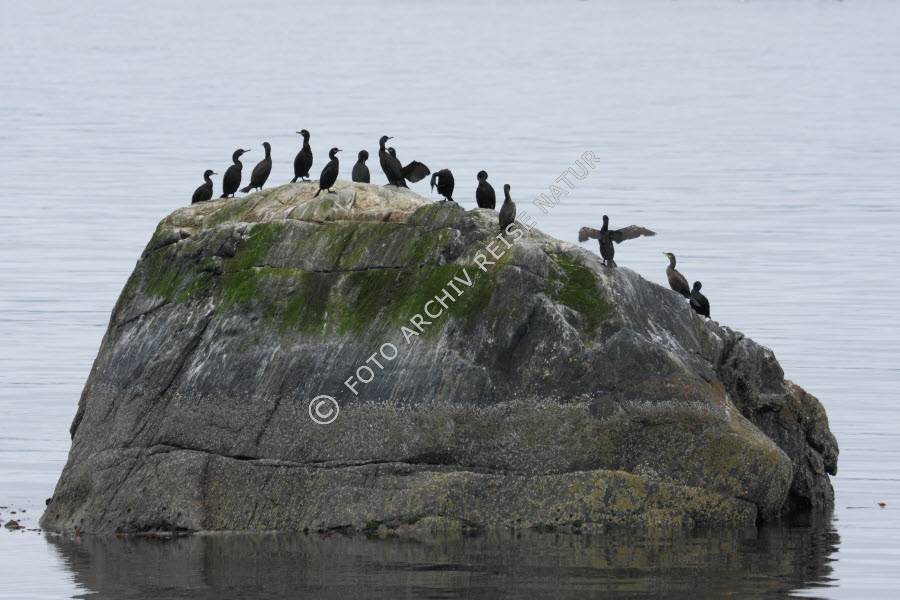 Fauna, Felsblock, Felsen, Felsklippe, Felsküste, Gewässer, Insel, Insel Runde, Kormorane, Krähenscharbe, Phalacrocorax aristotelis, Küste, Landschaft, Material, Meer, Møre og Romsdal, Nordmeer, Norwegen, Stein, Vogel,