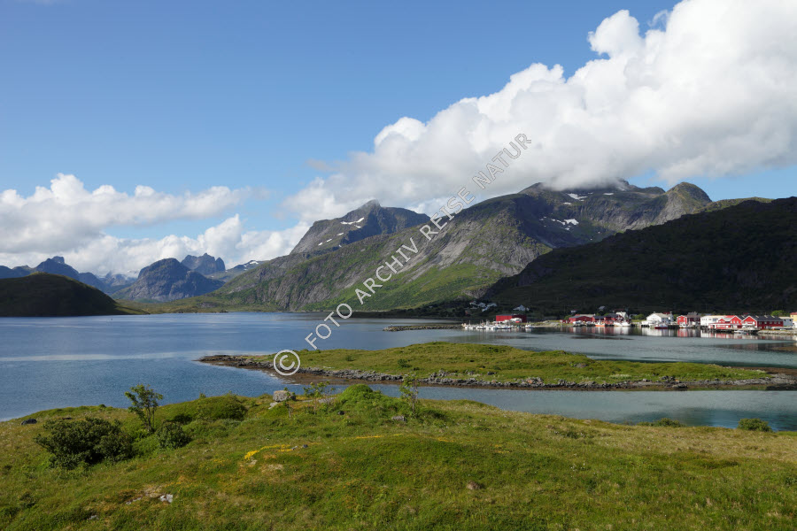 Keywords: Bergkette, Fjord, Fredvang, Gebirge, Gewässer, Landschaft, Lofoten, Moskenesøy, Nordland, Norwegen, Strand, Torsfjorden, Wiese, Wiesenstrand,
