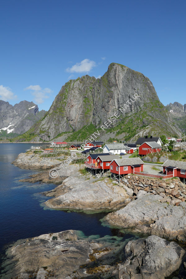 Keywords: Bauwerk, Berg, Bergspitze, Farbe, Felsen, Felsklippe, Felswand, Fischerhütte, Fjord, Gebäude, Gewässer, Gipfel, Hamnøy, Haus, Holzhaus, Hütte, Landschaft, Lofoten, Material, Moskenesøy, Nordland, Norwegen, Olstinden, Pfahlbau, Reinefjorden, Rorbu, Stein, Vorfjorden, blau, rot,