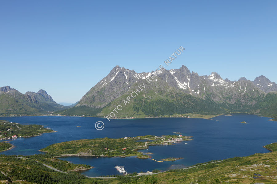 Austnesfjorden, Austvågøya, Bergkette, Fjord, Gebirge, Gewässer, Landschaft, Lofoten, Nordland, Norwegen, Sildpollen, Sildpollneset,