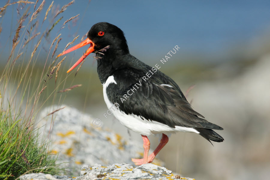 Austernfischer, Haematopus ostralegus, Fauna, Felsküste, Flakstad, Flakstadøy, Flora, Gras, Grasbüschel, Küste, Landschaft, Lofoten, Nordland, Norwegen, Vogel, Watvogel,