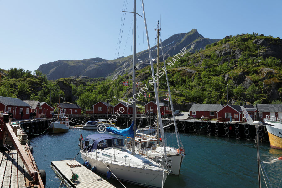 Bauwerk, Berg, Berghang, Bergspitze, Fischereihafen, Fischerhütte, Flakstadøy, Gebäude, Hafen, Haus, Holzhaus, Hütte, Lagerhaus, Landschaft, Lofoten, Mole, Nordland, Norwegen, Nusfjord, Pfahlbau, Rorbu, Schiffsanleger, Speicher, Wald,