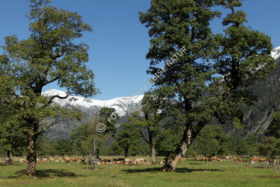 Keywords: Ahorngewächse, Alm, Baum, Bergahorn, Acer pseudoplatanus, Engalm, Fauna, Flora, Gebirge, Großer Ahornboden, Hinterriss, Hochtal, Huftier, Karwendel, Kuh, Kulturlandschaft, Landschaft, Rind, Säugetier, Tal, Tirol, Vomp, Weide, Österreich,