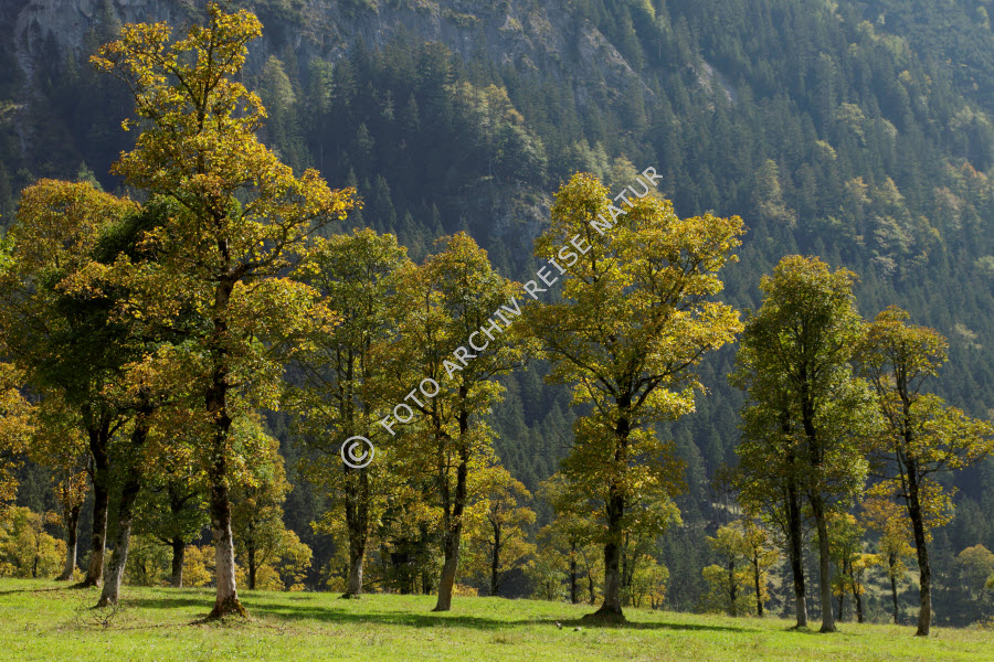 Ahorngewächse, Alm, Baum, Baumstamm, Bergahorn, Acer pseudoplatanus, Bergwald, Engalm, Farbe, Flora, Gebirge, Großer Ahornboden, Hinterriss, Hochtal, Karwendel, Krone, Kulturlandschaft, Landschaft, Naturschutzgebiet, Ort, Tal, Tirol, Vomp, Wald, Weide, bunt, gelb, orange, Österreich,