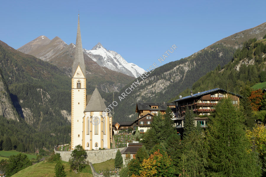 Keywords: Baustil, Bauwerk, Berg, Bergdorf, Berghang, Bergspitze, Bergwald, Dorf, Gebirge, Gebäude, Gegenstand, Gipfel, Gotik, Großglockner, Heiligenblut, Hochtal, Hohe Tauern, Kirche, Kirchenschiff, Kirchturm, Kulturlandschaft, Kärnten, Landschaft, Nadelwald, Nationalpark, Ort, Sakralbau, Stadt, Stadtansicht, Tal, Turm, Turmuhr, Uhr, Wald, Wallfahrtskirche, Österreich,