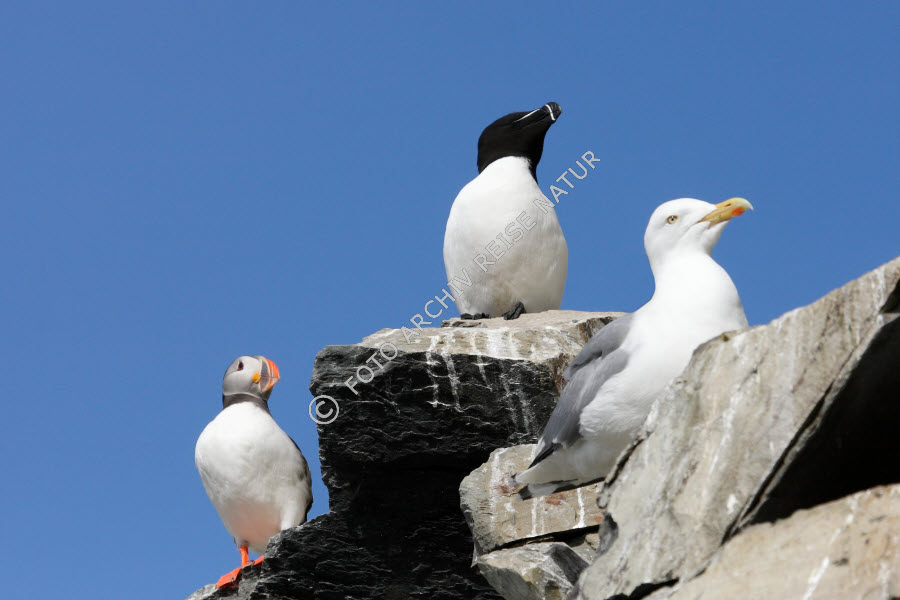 Friedliches Beieinander. Papageitaucher Tordalk Silbermøwe