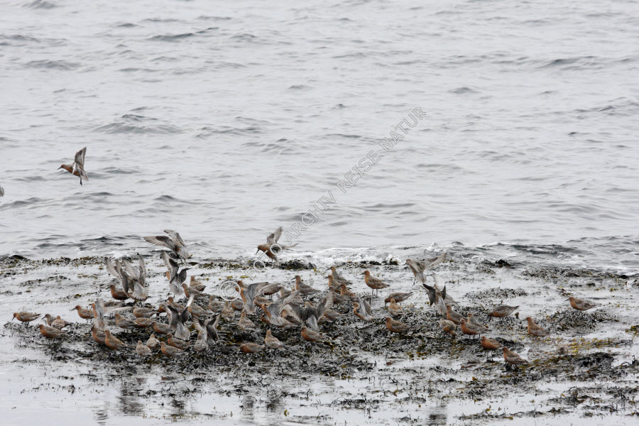 Barentssee, Ekkerøy, Fauna, Finnmark, Gewässer, Gruppe, Knutt, Calidris canutus, Landschaft, Lappland, Meer, Norwegen, Schnepfenvogel, Schwarm, Tiergruppe, Varanger, Vogel, Vogelschwarm, Watvogel,