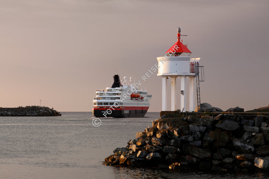 Die Nordkapp der Hurtigruten in der Hafenausfahrt von Berlevåg
