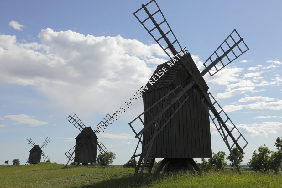 Bauwerk, Bockmühle, Gebäude, Haufenschichtwolke, Stratocumulus, Kulturlandschaft, Mühle, Schweden, Wetter, Klima, Wiese, Windmühle, Wolke, Öland,