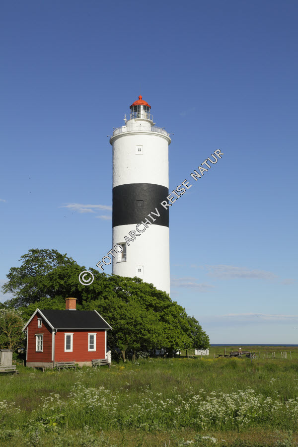 Keywords: Baum, Bauwerk, Farbe, Flora, Gebäude, Gewässer, Haus, Holzhaus, Landschaft, Leuchtturm, Marschland, Meer, Naturschutzgebiet, Ort, Ostsee, Ottenby, Turm, blau, rot, weiß,