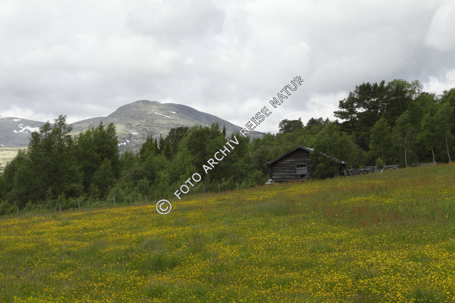 Almwiese, Bauwerk, Berg, Bergkette, Bergwiese, Blockhaus, Blumenwiese, Gebirge, Gebäude, Gipfel, Haus, Hedmark, Holzhaus, Kulturlandschaft, Landschaft, Norwegen, Weide, Wiese, Øversjødalen,
