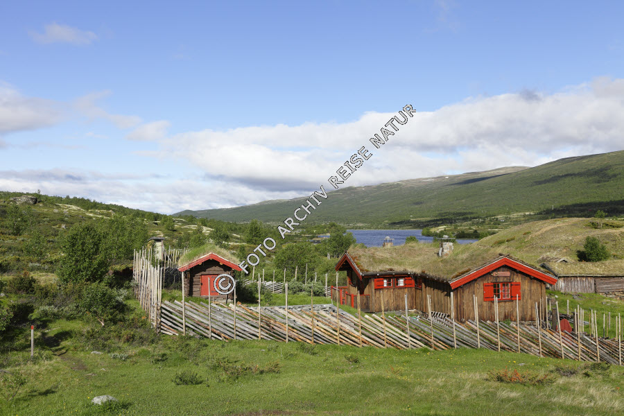 Bauwerk, Berg, Berghang, Bergkette, Dach, Einfriedung, Fjell, Gebirge, Gebäude, Gebäudeteil, Gewässer, Grasdach, Hjerkinn, Hütte, Landschaft, Norwegen, Oppland, See, Zaun,