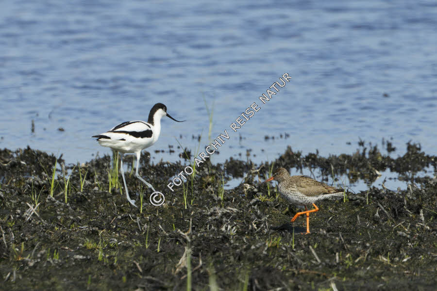 Fauna, Flachwasserzone, Gewässer, Landschaft, Rotschenkel, Tringa totanus, Schnepfenvogel, See, Strandsee, Säbelschnäbler, Recurvirostra avosetta, Vogel, Watvogel,