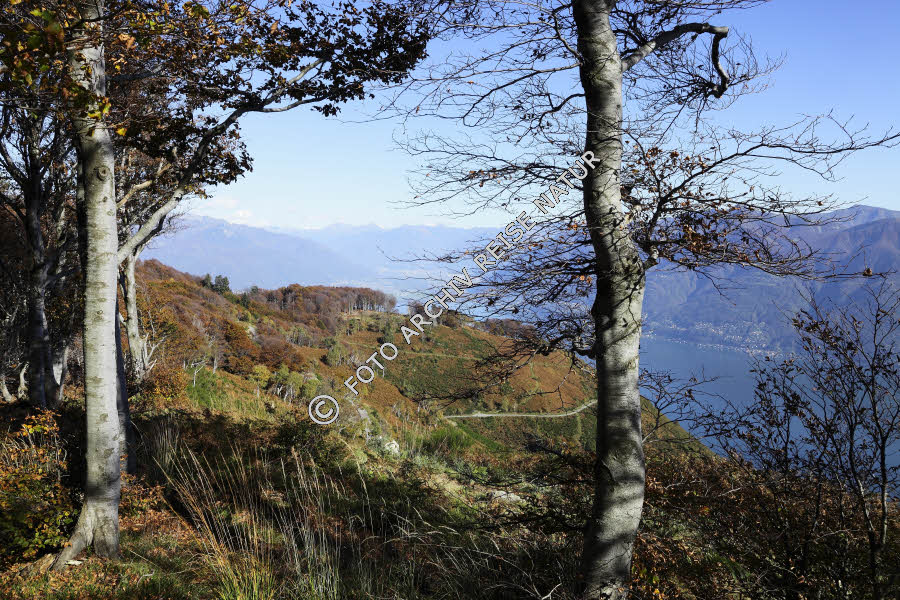Baum, Berg, Berghang, Bergwald, Buche, Fagus, Buchengewächs, Buchenwald, Farbe, Flora, Gewässer, Lago Maggiore, Landschaft, Laubwald, See, Wald, bunt,