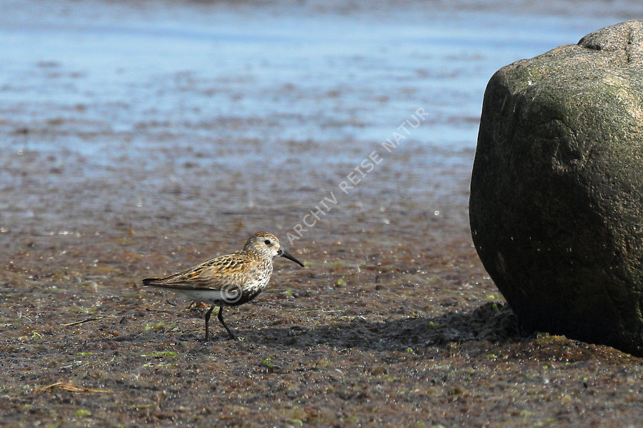 Alpenstrandläufer, Calidris alpina, Fauna, Felsblock, Felsen, Flachwasserzone, Gewässer, Kalmarsund, Landschaft, Material, Meer, Naturschutzgebiet, Ort, Ostsee, Ottenby, Schnepfenvogel, Stein, Vogel, Watvogel,