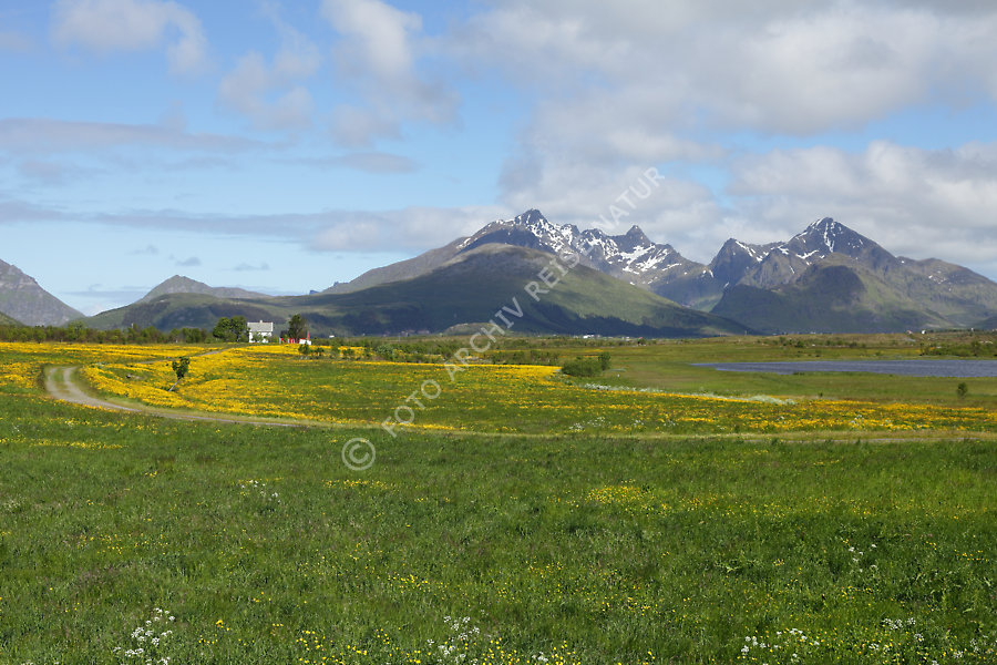 Bergkette, Bergmassiv, Blumenwiese, Gebirge, Kulturlandschaft, Landschaft, Lofoten, Nordland, Norwegen, Storeid, Vestvågøy, Weide, Wiese,