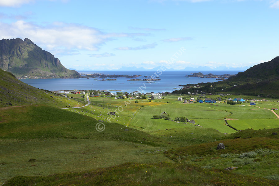 Keywords: Dorf, Farbe, Fjord, Gewässer, Insel, Kulturlandschaft, Landschaft, Lofoten, Nordland, Norwegen, Schäre, Schärengarten, Sennesvika, Vestfjorden, Vestvågøy, Weide, Weiler, Wiese, Wiesenhang, blau,