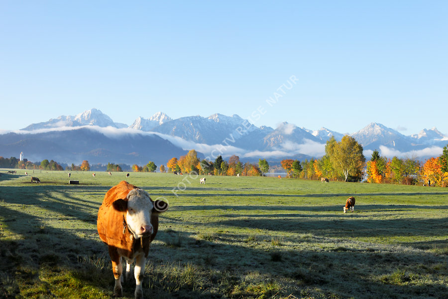Allgäu, Alpen, Bayern, Bergkette, Brunnen, Deutschland, Fauna, Gebirge, Huftier, Kuh, Kulturlandschaft, Landschaft, Rind, Schwangau, Säugetier, Weide,