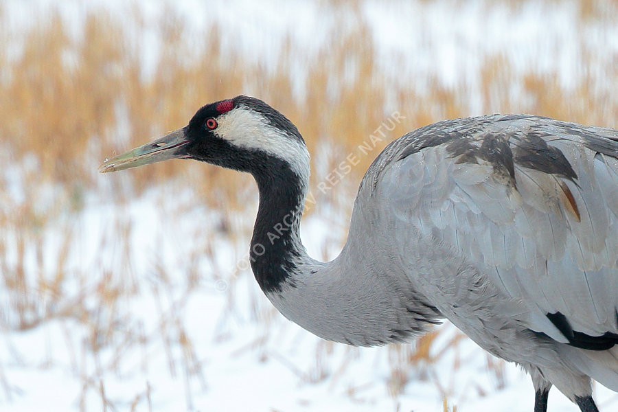 Kranich beim Zug ins Brutgebiet vom Neuschnee überrascht