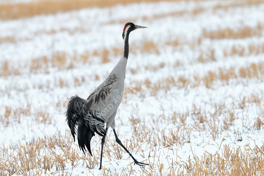 Kranich beim Zug ins Brutgebiet vom Neuschnee überrascht